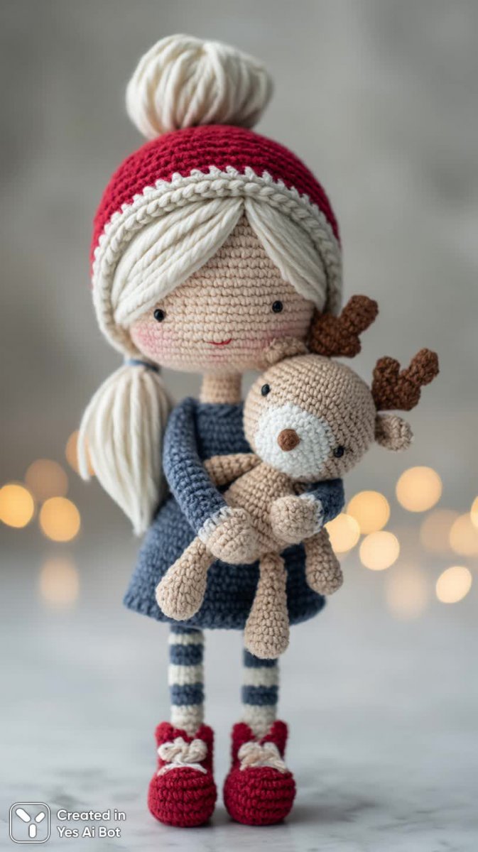 Очаровательная вязаная кукла ручной работы излучает праздничное настроение и неподдельную теплоту. Её светлые волосы аккуратно собраны в элегантный пучок, а на голове красуется весёлый колпак Санты, создающий атмосферу волшебства. Яркий красный свитер добавляет образу жизнерадостности и праздничного акцента. В объятиях кукла нежно прижимает мягкого плюшевого оленёнка, символизируя уют и заботу. Круглое личико украшают большие голубые глаза, наполненные искренней добротой и наивностью. Фон выполнен в нейтральном белом цвете, что позволяет полностью сосредоточиться на деталях вязаной текстуры и праздничном духе куклы. Высокое качество изображения обеспечивает чёткость и реалистичность каждой детали, от мельчайших узоров на свитере до мягкости шерстяных волосков. Мягкое освещение подчеркивает объёмность и фактуру изделия, создавая ощущение тепла и комфорта. Этот милый персонаж станет прекрасным подарком или украшением интерьера, наполняя дом атмосферой праздника и уюта. Вязаная кукла – это воплощение ручной работы, заботы и любви, способное подарить радость и улыбку каждому, кто на неё взглянет. Она словно соткана из волшебства и детских мечтаний, принося в дом частичку сказки