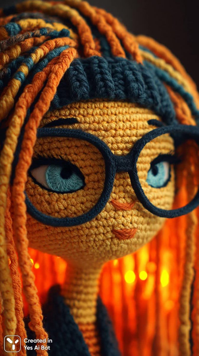 close-up of crocheted doll’s face, round face with big blue eyes, small smile, black glasses slightly tilted, orange hair, soft lighting.