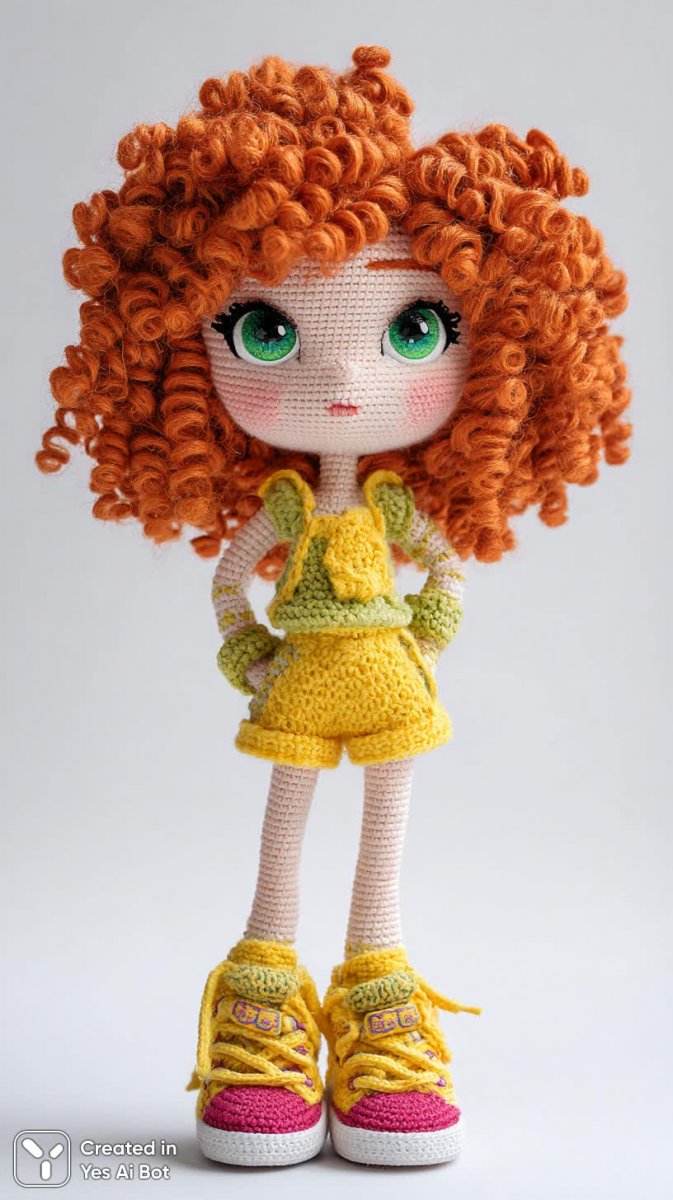 crocheted doll with green eyes, wearing pink sneakers and yellow skirt, red hair styled messily, standing upright on white bg, high-quality.