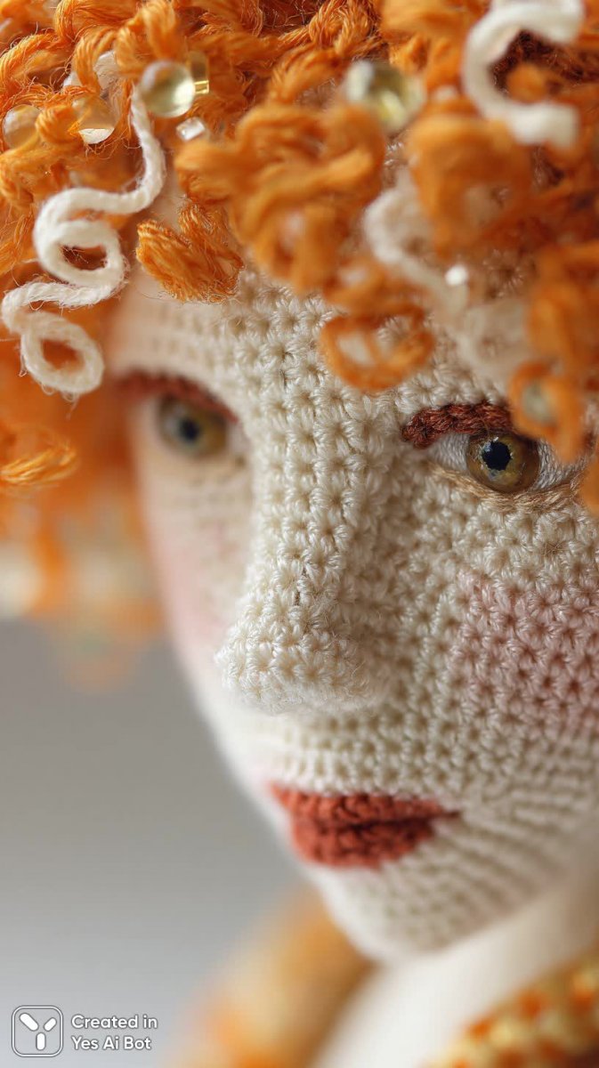 Нежный портрет авторской куклы ручной работы, выполненной в технике вязания крючком, пленяет своей трогательной детализацией и очаровательной простотой. В центре внимания – лицо куколки с округлыми чертами, наивно-милые черты лица излучают тепло и безмятежность. Миниатюрный носик добавляет образу непосредственности и искренности, а рыжеватые волосы, хаотично уложенные, придают кукле неповторимый шарм и индивидуальность. Декоративные бусины, искусно вплетенные в прическу, служат акцентом, подчеркивая кропотливую работу мастера и его внимание к мелочам. Фон, выполненный в лаконичном белом цвете, позволяет полностью сосредоточиться на деталях лица куклы, не отвлекая внимания лишними элементами. Мягкое освещение создает атмосферу уюта и тепла, подчеркивая текстуру вязаного полотна и придавая изображению объемность. Тщательно проработанные черты лица, выразительные глазки и аккуратная россыпь деталей демонстрируют высочайший уровень мастерства рукодельницы. Эта кукла – настоящее произведение искусства, воплощенное в шерстяных нитках. Она станет прекрасным подарком для любителей ручной работы, коллекционеров кукол или просто тех, кто ценит красоту и уникальность. В ее очаровательном облике можно разглядеть частичку души мастера, вложившего в создание этой куклы свою любовь и вдохновение. Это не просто игрушка – это символ тепла, заботы и детства, способный подарить радость и улыбку своим обладателям. Она словно оживает на глазах, приглашая зрителя окунуться в мир волшебства и фантазии