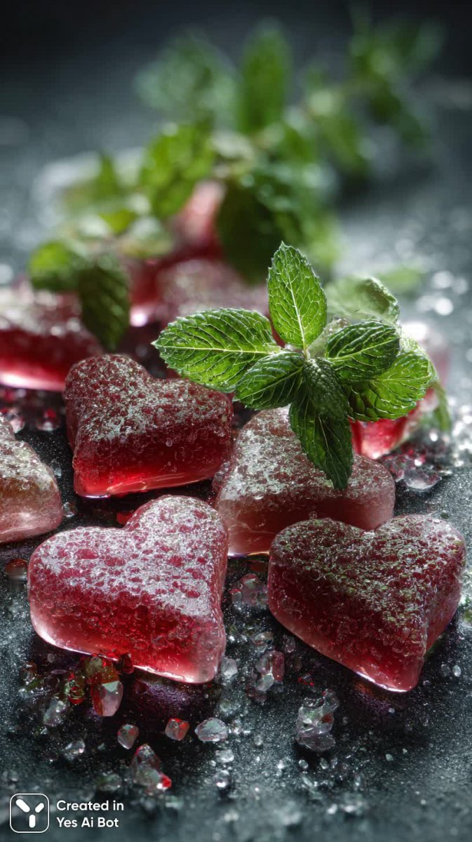 hyper realistic, photorealistic enchanting arrangement of sparkling sugar hearts, interspersed with mint leaves on a dark BG, showcasing vibrant colors and a tempting appearance.