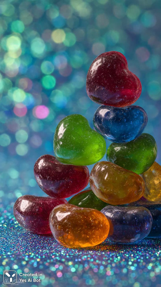 Восхитительная композиция из конфеток в форме сердечек, выполненная с поразительной фотореалистичностью и гиперреализмом. Яркие цвета этих лакомств создают ощущение праздника и радости, а их блестящая поверхность, подчёркнутая мерцающим фоном, притягивает взгляд своей насыщенностью и глубиной. Каждая конфета прорисована с невероятной детализацией, передавая текстуру гладкой оболочки и внутреннее сияние. Эта съёмка — настоящий гимн сладости и красоте, способный пробудить аппетит и вызвать улыбку одним своим видом. Безупречное исполнение позволяет зрителю ощутить маслянистость и нежность каждой конфетки, словно протягивая руку, чтобы попробовать это визуальное наслаждение. Использование глиттера добавляет образу волшебства и сказочности, превращая обычные сладости в произведение искусства. Композиция идеально сбалансирована, а игра света и тени подчёркивает объёмность и реалистичность каждой детали. Этот снимок – идеальное воплощение концепции 'сладкой жизни', наполненное позитивом и эстетическим удовольствием. Он вызывает ощущение лёгкости, радости и беззаботности, даря хорошее настроение и приятные эмоции каждому, кто на него смотрит. Это не просто фотография конфет, это запечатлённый момент счастья и наслаждения