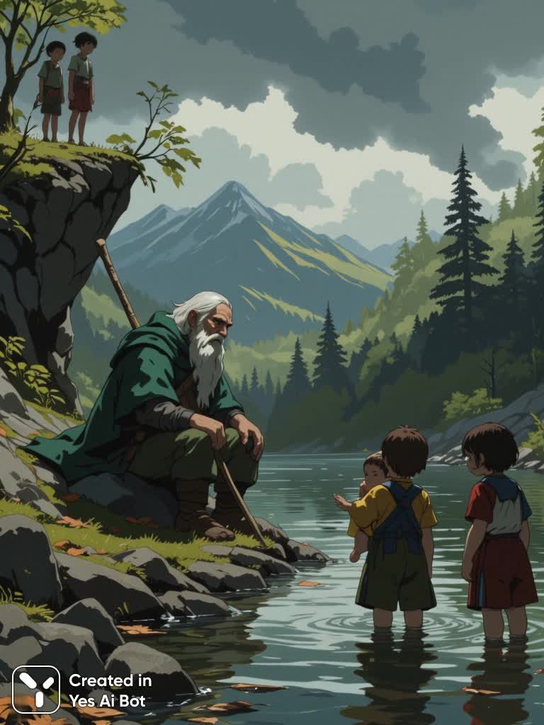 A landscape with three children playing in the water. In the background, a mountainous landscape with trees and bushes can be seen. The sky is covered with dark clouds, and the ground is covered with fallen leaves. In the foreground is a man, a water gnome, with long hair and a beard, dressed in a green cloak and holding a stick in his hand. He is sitting on a rock and appears to be looking at the water with a sad expression on his face. On the right are two children, one of whom is holding a small child in his arms. The child on the left is standing on the edge of a cliff and looking at the man with a worried expression on his face. Two othe...
