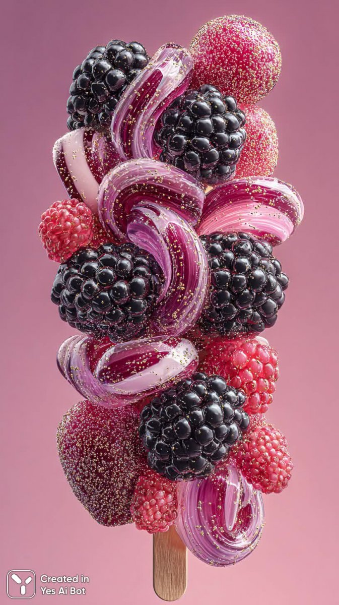 hyper realistic, vibrant colors, raspberries stacked arrangement, blackberries scattered around, pink BG, delicious textures, close-up of colorful gummy candies, swirling around the delicate pastries, hd, hdr, soft light, sparkling, shimmering with gold dust on the surface, food photography in the style of blackberry popsicle.