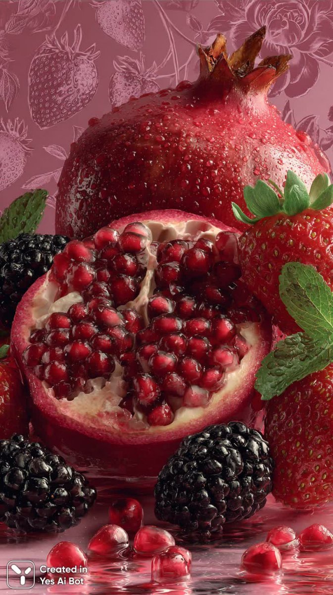 hyper realistic, pomegranate cut in half with its seeds spilling out and water splashing around it, pink glittery strawberry-shaped wallpaper, scattered fruits like strawberries and blackberries, delicious, hd, raw, mint leaves adds an extra touch.