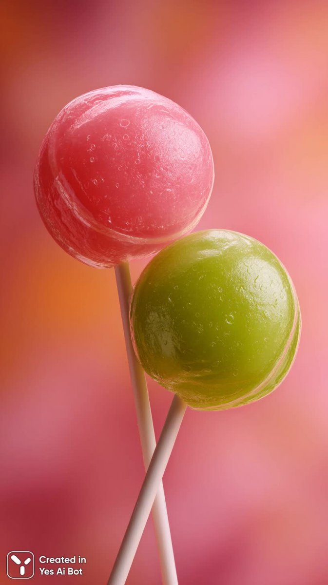 two lollipops, one pink and one green, against a pink bg, hdr, hd, no blur effect, no shadows, delicious textures.