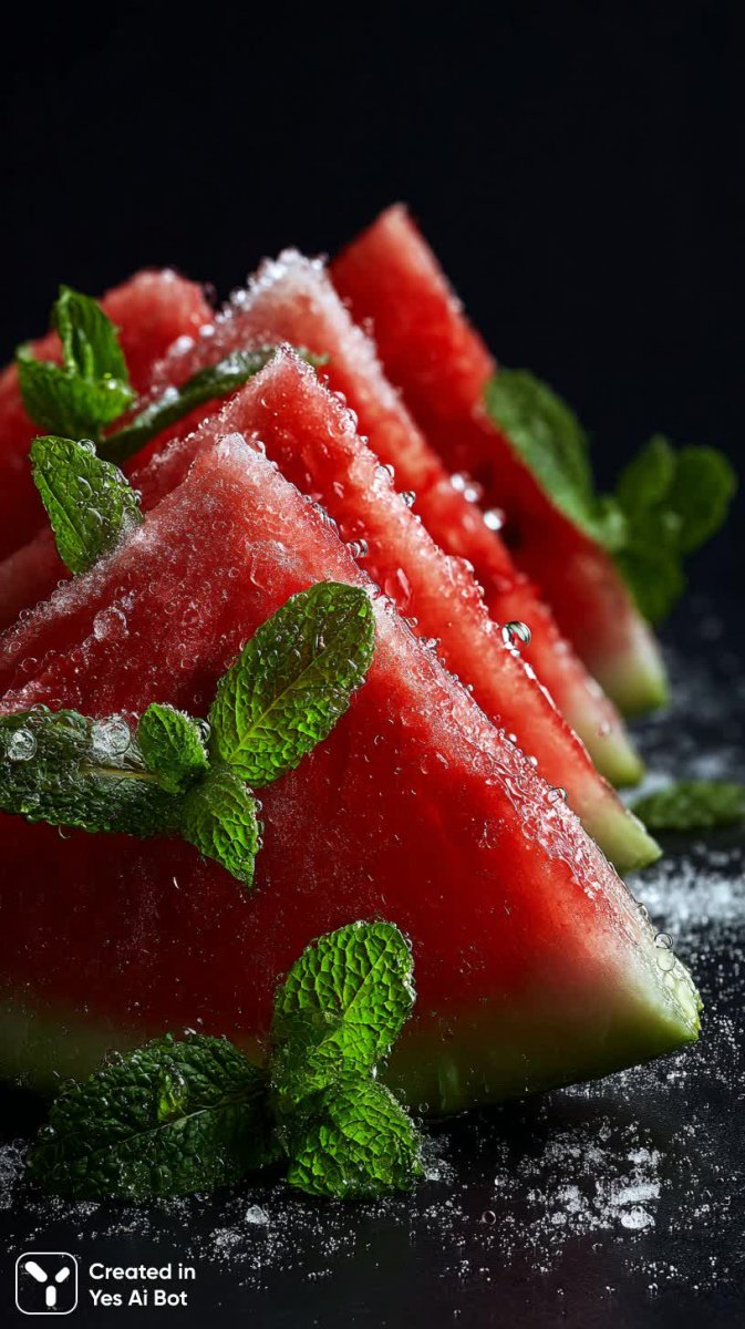 Сочные ломтики арбуза с листиками мяты, словно ожившие на фотографии, предлагают освежающий глоток летнего дня. Изображение выполнено в гиперреалистичной манере, имитирующей профессиональную фуд-фотографию. Насыщенные цвета и мельчайшие детали создают ощущение абсолютной свежести и аппетитности. Черный фон подчеркивает яркость арбуза и зелени, фокусируя внимание на текстуре сочного плода и хрустящих листьев мяты. Кажется, будто можно почувствовать легкий аромат летнего сада и прохладу спелого арбуза. Это не просто фотография – это визуальное наслаждение, вызывающее желание немедленно попробовать этот освежающий десерт. Идеально подойдет для рекламы напитков, фруктов или летних мероприятий, создавая атмосферу легкости и безмятежности. Композиция отличается продуманностью: каждый ломтик арбуза расположен так, чтобы подчеркнуть его сочность и привлекательность, а листья мяты добавляют нотку свежести и элегантности. Фотография передает не только визуальный образ арбуза, но и ощущение вкуса – сладкого, освежающего и невероятно аппетитного