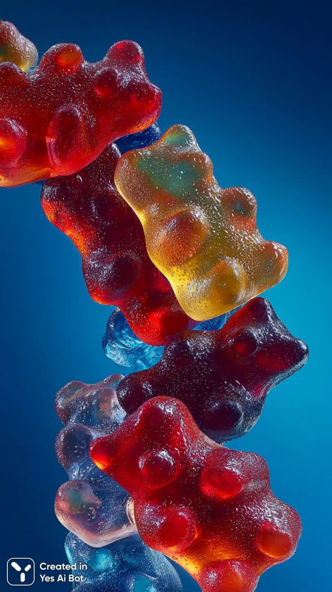 hyper realistic, photorealistic close-up of colorful gummy bears and jelly candies, with a vibrant blue BG, dynamic arrangement showcasing bright hues and textures, soft lighting enhancing the delightful appearance.