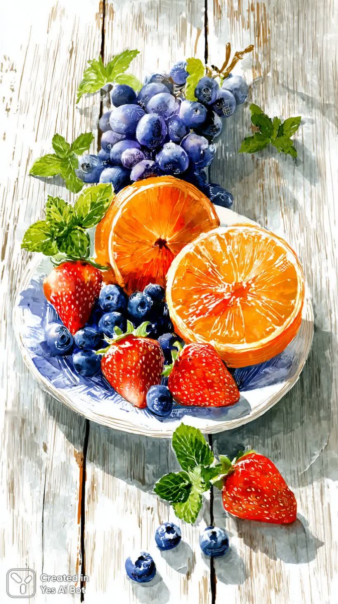 Яркая акварельная иллюстрация изобилия и свежести – на деревянном столе красуется аппетитный поднос с фруктами. В центре композиции сочные дольки апельсинов, привлекающие внимание своим насыщенным цветом. Рядом разложены спелые клубники, излучающие сладость и аромат лета. По всему подносу хаотично раскиданы голубые ягоды черники, добавляющие игривости и текстуры. Зеленый гроздь винограда завершает эту фруктовую симфонию, приглашая насладиться каждым кусочком. Несколько листиков мяты, изящно украшающих поднос, придают изображению свежесть и легкость. Общая стилистика картины – светлая и жизнерадостная, наполненная позитивными эмоциями и ощущением летнего настроения. Эта иллюстрация станет прекрасным дополнением для кулинарных блогов, меню ресторанов или просто украшением интерьера, создавая атмосферу уюта и тепла. Картина передает ощущение изобилия, здоровья и радости жизни, вызывая аппетит и желание попробовать все эти восхитительные фрукты. Акварельная техника придает изображению мягкость и воздушность, делая его особенно привлекательным для любителей живописи. Эта работа – настоящий гимн летним ягодам и фруктам, воплощенный в ярких красках и нежной акварели