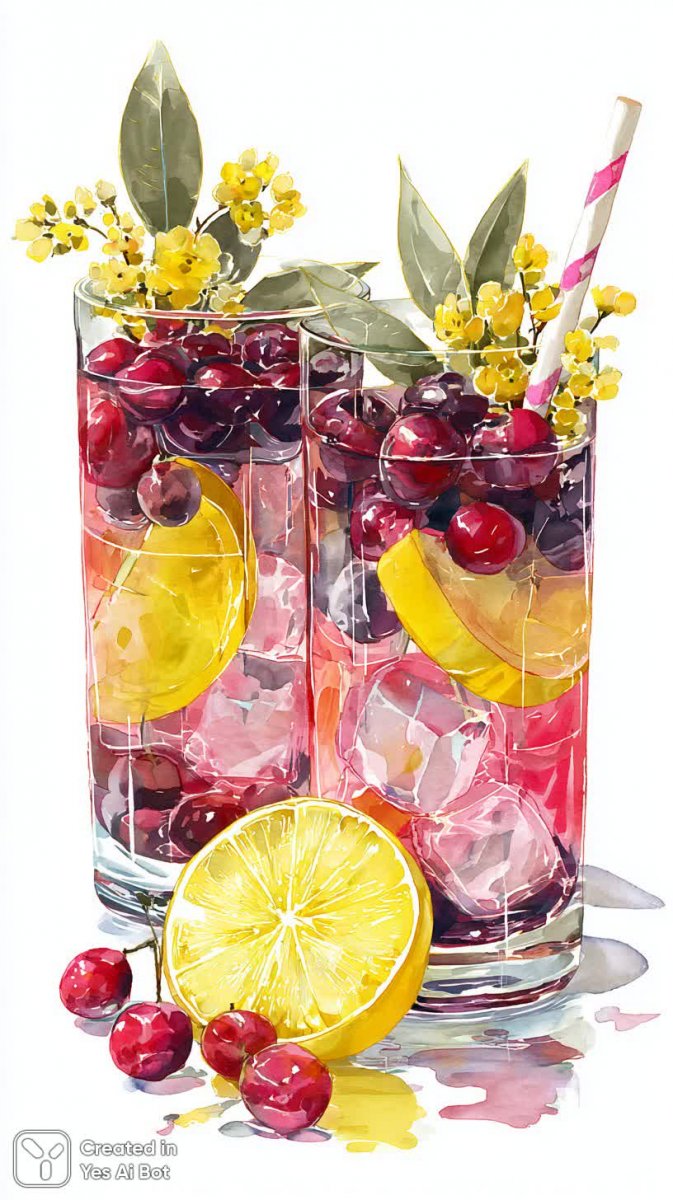 Яркий и жизнерадостный рисунок в технике туши переносит нас в мир беззаботного веселья и летнего настроения. В центре композиции – два высоких стеклянных бокала, наполненных сочными ягодами и нежными желтыми цветами. Один из них искрится насыщенным розовым оттенком, словно наполненный клубничным лимонадом, а другой привлекает внимание своим глубоким коричневым цветом, намекая на вкус терпкого ягодного компота. Оба бокала украшены милыми деталями: разноцветная леденец и игривая полосатая трубочка добавляют шарма и подчеркивают беззаботный характер изображения. Вокруг бокалов хаотично разбросаны спелые клубники, создавая ощущение изобилия и летнего щедрости. В правом нижнем углу заметен дольчик лимона, который привносит нотку свежести и цитрусовых ароматов. Фон выполнен в чисто белом цвете, что позволяет ярким краскам ягод и цветов заиграть с новой силой, не отвлекая внимания от основной темы. Стиль рисунка – это настоящая феерия воображения: он полон легкости, игривости и очарования, вызывая улыбку и желание окунуться в этот сказочный мир сладких напитков и летнего веселья. Это идеальное воплощение радостного настроения и прекрасного момента, запечатленного на бумаге с помощью простого, но выразительного инструмента – туши. Изображение излучает позитив и дарит ощущение тепла и уюта, словно приглашая насладиться прохладным напитком в компании близких людей