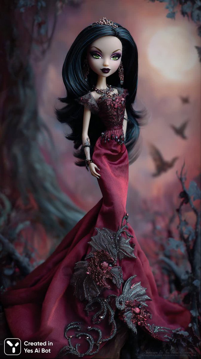 Загадочная Королева-вампир из Монстер Хай предстает в образе воплощенной элегантности и готической роскоши. Ее длинные черные волосы ниспадают волнами, создавая контраст с драматичным бальным платьем насыщенного бордового цвета, украшенным серебряными акцентами, словно отблески лунного света на ночном небе. Макияж подчеркивает ее аристократическую красоту: темные губы добавляют образу загадочности и чувственности, острые скулы выделяют выразительность лица, а пронзительные зеленые глаза излучают хищный взгляд. На ее голове красуется серебряная корона, символ власти и величия, подтверждающий ее статус правительницы ночного мира. Поза Королевы-вампир исполнена достоинства и уверенности: она возвышается над окружающим миром, словно владычица своей судьбы. Фоном для этой захватывающей сцены служит таинственный туманный лес, населенный сотнями летучих мышей, парящих в лунном свете. Полная луна, висящая высоко в небе, заливает все вокруг своим серебристым сиянием, создавая атмосферу мистики и волшебства. Этот образ – воплощение готической эстетики, сочетающее в себе мрачную красоту, элегантность и силу. Королева-вампир из Монстер Хай предстает как символ ночи, таинственности и вечной красоты, пленяющей воображение зрителя. Ее царственный облик и окружение создают ощущение погружения в сказочный мир, где правят тени и лунный свет. Она – истинная королева своей мрачной, но прекрасной вселенной