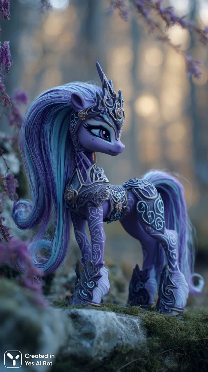 a stunning monster high centaur character with a striking gradient mane of blue and purple, dressed in an elegant armor set with intricate details, her horse half features a shimmering coat that reflects light, posed in a mystical enchanted forest surrounded by magical creatures and glowing flowers.