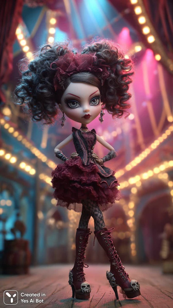 a goth-inspired monster high doll with a vintage circus theme, wearing a striped outfit with ruffles, bright red and black color palette, high top boots with skull motifs, vibrant hair styled in dramatic curls, posing confidently under a big top tent with colorful lights illuminating the scene.