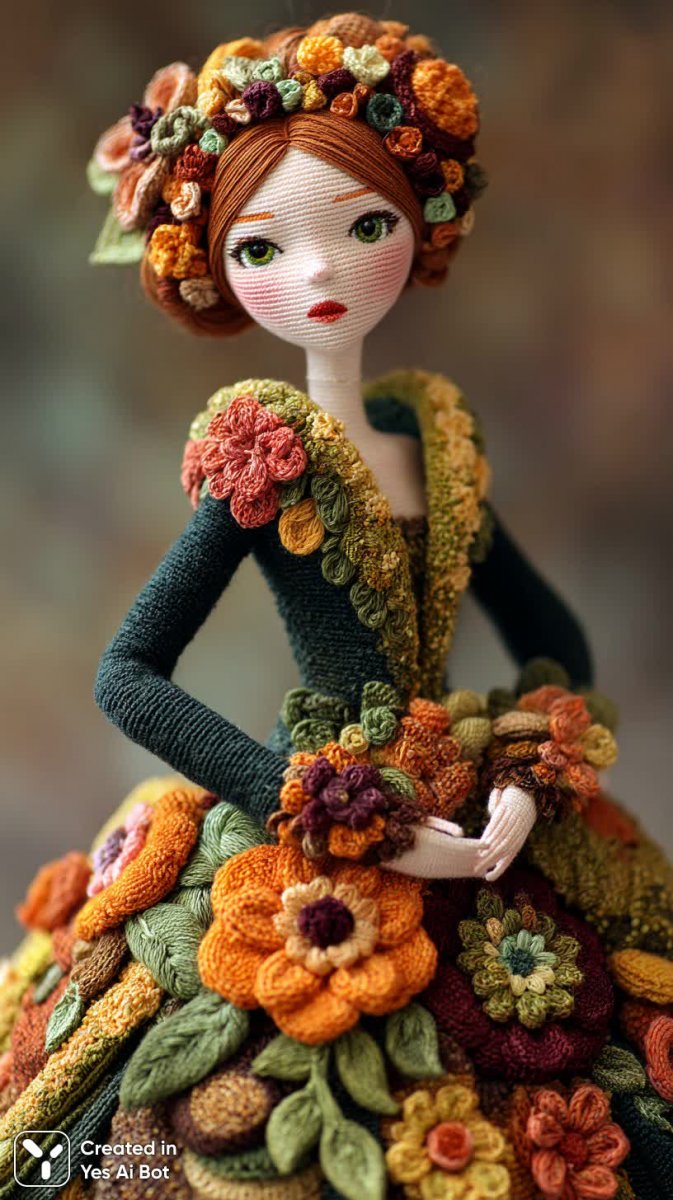 a crocheted doll dressed in a floral gown, portrait of artdoll, delicate yarn work, vibrant colors, inspired by fashion illustration, full body display, dollpunk style, vintage charm.