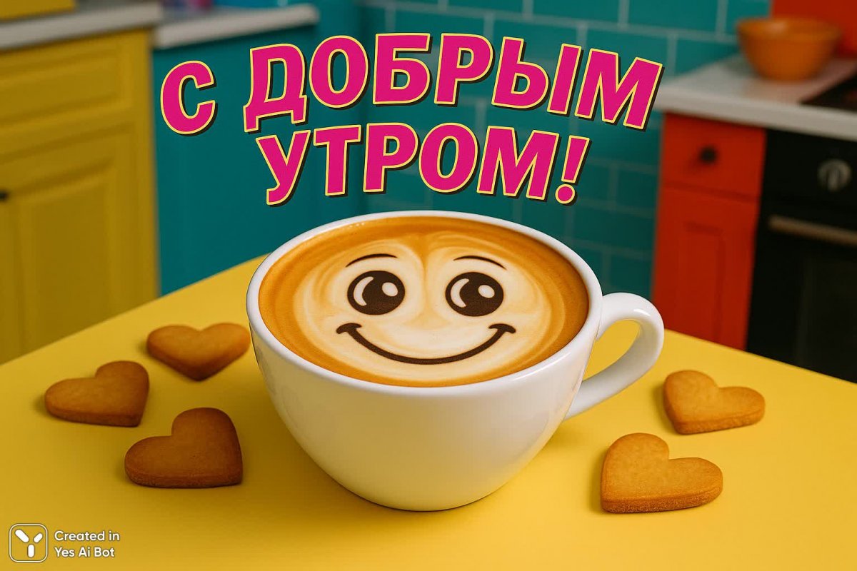 Плоский латте-арт на кофейной чашке в виде улыбающегося лица с большими глазами, вокруг разложенное печенье в форме сердца, на фоне кухни с яркими акцентами, создающее атмосферу веселья и уюта. Надпись ярким шрифтом: "С добрым утром!".