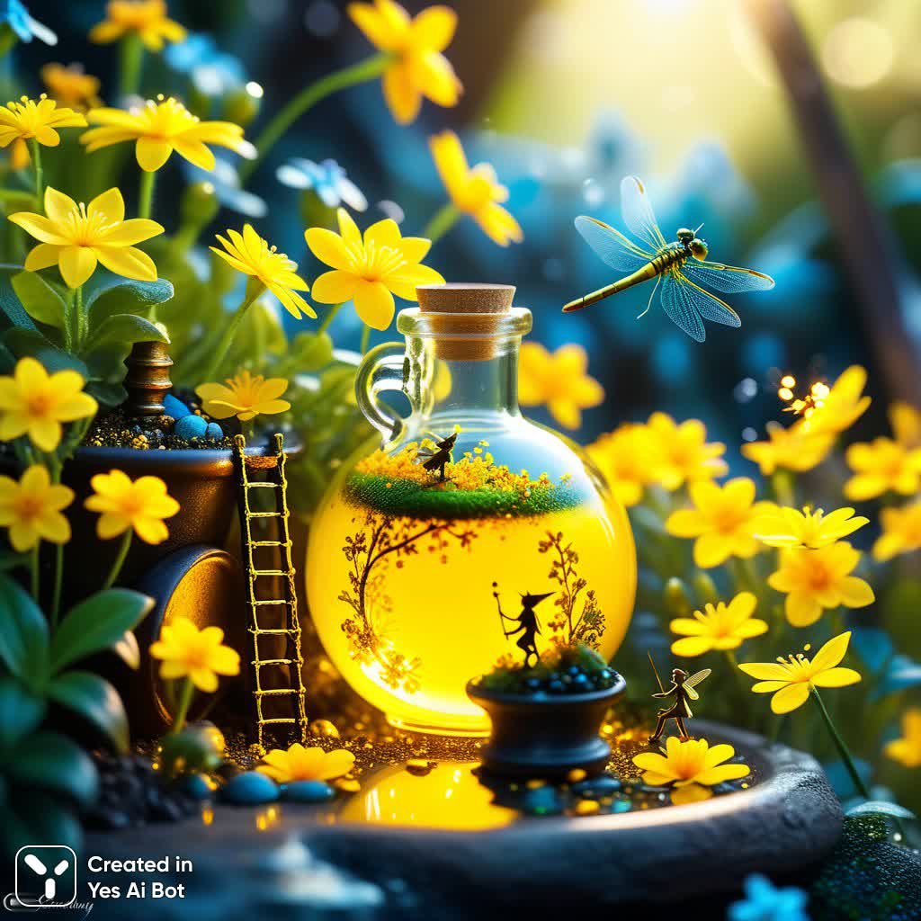 Завораживающий мир сказки и волшебства оживает в этом невероятном фотоколлаже. Представьте себе микроскопический пейзаж эльфов, заключенный в яркий желтый круг купающихся цветов, залитых теплым золотым светом дня. Миниатюрные лестницы извиваются вверх, по которым ловко взбираются крошечные эльфы, занятые волшебным делом – они варят магические зелья в миниатюрных горшочках и переливают их в крохотные флакончики. Вся сцена пронизана мистическим сиянием: вспышки света, перламутровое мерцание, блеск звезд, нежные крылья стрекозы, сверкающий поталь и золотой хайлайтер создают атмосферу невероятной фантазии. Этот шедевр, выполненный в стиле фэнтези с использованием передовых технологий RTX и ультравысокого разрешения, словно сошел со страниц волшебной книги или ожил на Pinterest. Это не просто изображение – это портал в другой мир, где царят чудеса и магия. Удивительные детали и безупречная композиция завораживают взгляд, а игра света и тени создает ощущение глубины и реальности происходящего. Почувствуйте себя наблюдателем за жизнью маленьких эльфов, погрузитесь в их волшебный мир и насладитесь красотой этого фантастического фотомонтажа. Каждое сверкающее пятнышко, каждая деталь пейзажа – результат кропотливой работы и мастерства фотографа-художника. Это произведение искусства, которое заставляет поверить в чудо