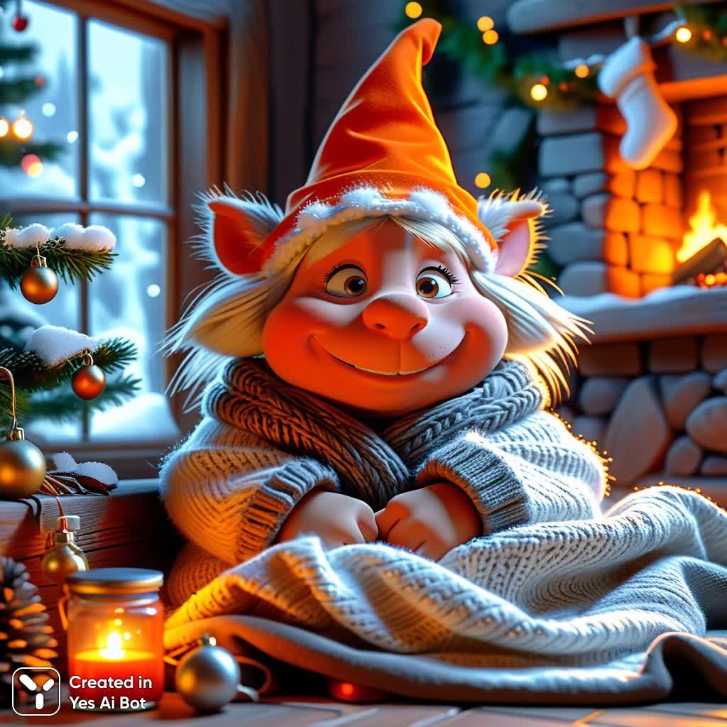 Мумий Тролль в стиле Туве Янсон мульт cartoon sly smile 3D рендер,спит укутан сладко спальне на кроватке на боку под одеялом,уютная подушка, наполу елочные иголкив окне мурмурация снежинок , выражение лица счастливоесонное баночка варенья на столике детализированные блики на металле ,огонь камина, атмосфера уюта ,возле камина New Year tree , сидит fanny Муми троль , кадр вращается с легким замедлением, реалистичные текстуры меховые белые реснички и костюма, теплое оранжевое освещение