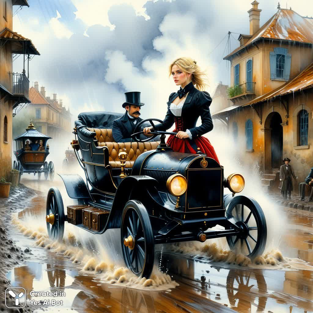 Загадочная и меланхоличная картина, сотканная из элементов стимпанка и викторианской эпохи, переносит зрителя в атмосферу увядающей красоты и индустриального прогресса. Художественная работа, выполненная в технике акварели и карандаша, передает ощущение хрупкости времени и мимолетности мгновения. В центре композиции – молодая блондинка за рулем стимпанк-автомобиля, преодолевающего сложный рельеф из грязи и воды под проливным дождем. Изображение пронизано духом викторианской эпохи с ее строгими линиями и элегантными деталями, которые органично сочетаются с футуристическими элементами стимпанка – шестеренками, паровыми двигателями и сложной механикой. Мягкие переходы акварельных цветов создают эффект размытости и мечтательности, подчеркивая ощущение лимбо, переходного состояния между реальностью и фантазией. Погружаясь в эту картину, зритель чувствует себя свидетелем чего-то утерянного, забытого – фрагмента истории, запечатленного в моменте. Работа Винсенте Ромеро Редондо и Грега Симкинса представляет собой уникальное сочетание жанров и техник, создавая визуальный шедевр, который вызывает глубокие эмоции и размышления о времени, прогрессе и человеческой судьбе. Картина передает атмосферу таинственности и ностальгии, погружая зрителя в мир фантазий и мечтаний, где прошлое и будущее переплетаются воедино. Это не просто изображение – это история, рассказанная языком искусства, способная тронуть самые тонкие струны души