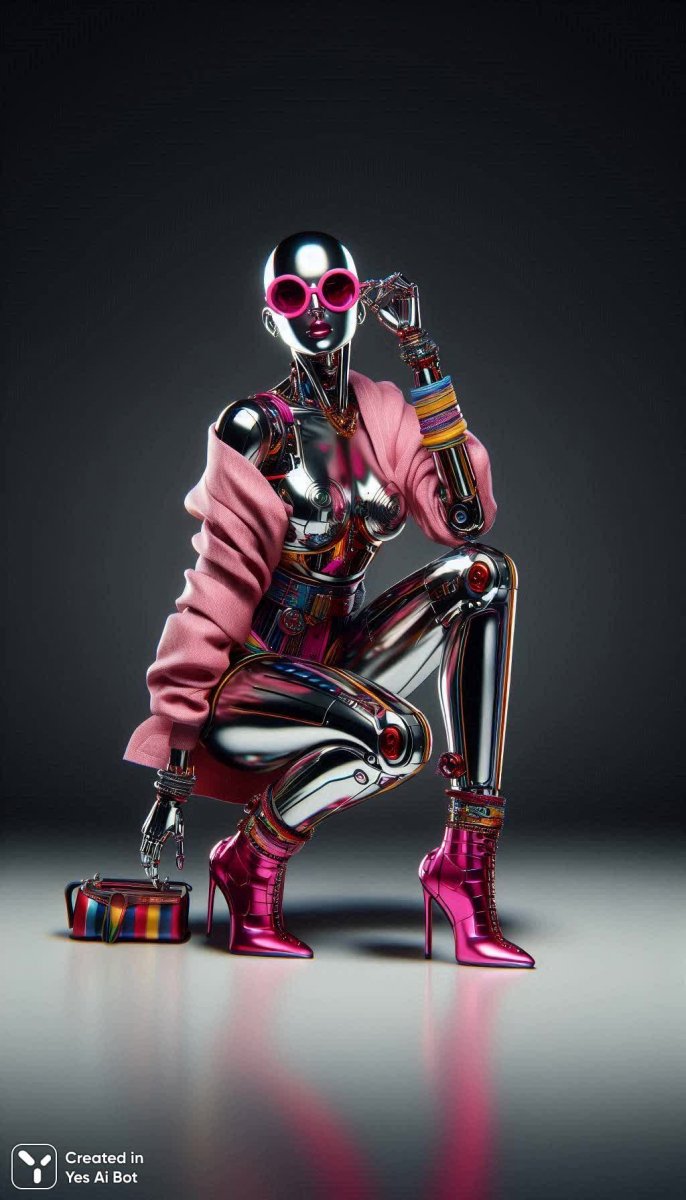 2. full-body shot of a robotic woman with chrome features, showcasing vibrant fashion accessories, pink sunglasses, and high heels, set in a clean minimalist setting, celebrating the aesthetics of 1980s vintage style.