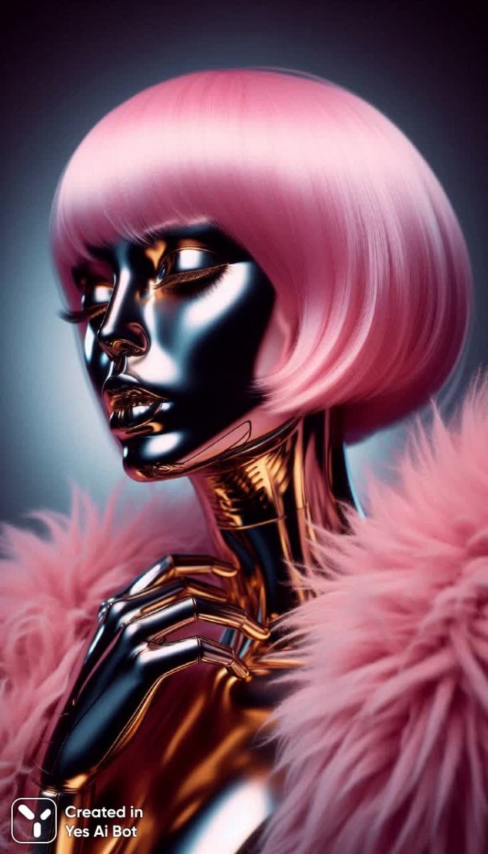 close-up of a chrome woman in a pink fluffy outfit, inspired by Hajime Sorayama, exhibiting golden touches, captured against a minimalistic yet vivid backdrop that enhances the futuristic vibe.