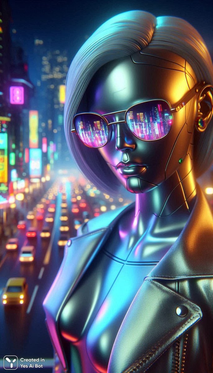 Завораживающий трехмерный рендер андроидной девушки с серебристой металлической кожей, облаченной в облегающий блестящий комбинезон. Изображение демонстрирует потрясающую детализацию и сочетает в себе элементы киберпанка и эстетики 80-х годов. Яркие аксессуары дополняют образ, а стильные солнцезащитные очки добавляют шарма и загадочности. Девушка эффектно выделяется на фоне футуристического городского пейзажа, создавая ощущение динамики и технологичного прогресса. Эта цифровая иллюстрация представляет собой гармоничное сочетание передовых технологий и ретро-стиля, погружая зрителя в атмосферу будущего, где прошлое и настоящее сливаются воедино. Использование металлических оттенков подчеркивает ее искусственную природу, а облегающий комбинезон акцентирует внимание на плавных линиях тела, создавая визуально привлекательный образ. Сложная детализация кожи и аксессуаров свидетельствует о высоком уровне мастерства художника, а футуристический город служит идеальным фоном для этой технологичной красоты. Это не просто изображение – это взгляд в возможное будущее, где андроиды становятся частью нашей жизни, сочетая в себе силу технологий и эстетику дизайна. Вся композиция пронизана ощущением скорости, моды и инноваций, делая ее привлекательной для любителей киберпанка, научной фантастики и современного искусства