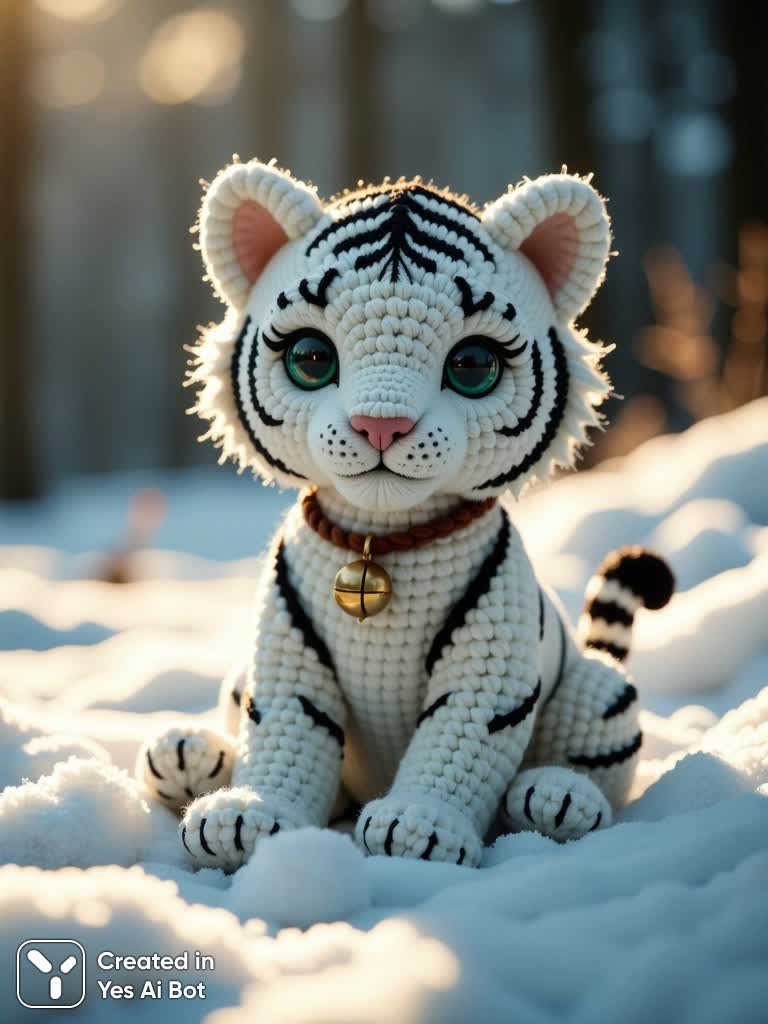 A meticulously crafted, crocheted white tiger cub dominates the scene, set against a blurred, wintery backdrop. The cub, rendered in soft, textured white yarn, features meticulously crocheted black stripes, creating a realistic tiger pattern. Large, round, vibrant green eyes dominate the face, expressing a gentle curiosity. The cub's nose is a delicate pink. A small, golden-brown bell hangs around its neck. The tiger is posed, sitting on a bed of fresh, fluffy snow, partially burying its paws. The snow is textured, reflecting the soft light. The background is softly blurred, suggesting a snowy forest or field, with hints of warm, golden sunli...