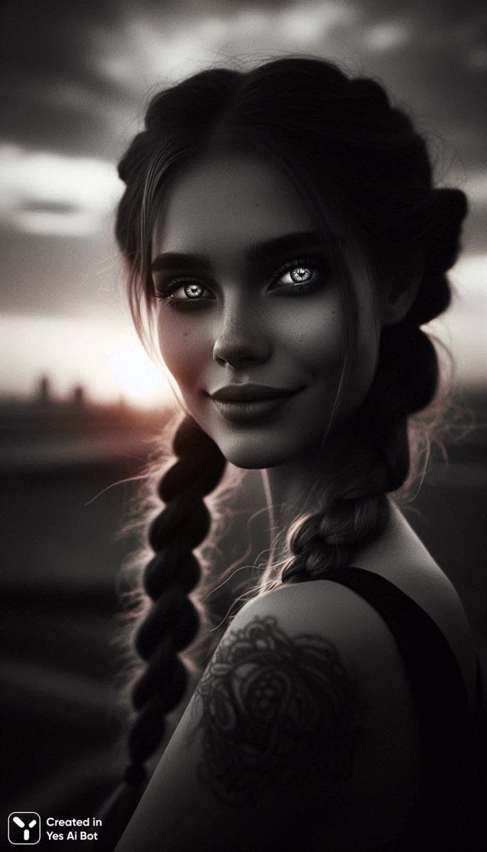 плёнка, чёрно-белая фотография, игра света и тени, девушка с плетеными волосами, закат в глубоком фоне, контраст, искренняя улыбка, эффект старой фотографии, стеклянные глазки с отражениями, симметричное тату на руке, лёгкое движение, готический шифон, нежные пастельные тона, замысловатые композиции, закрученные формы, атмосферная глубина и насыщенность изображения.