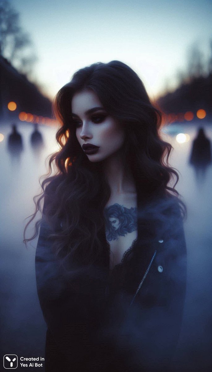 Загадочная встреча в сумрачном свете: завораживающая красота сочетается с готической эстетикой. Изображение, словно сошедшее со старой пленки, дышит ностальгией и таинственностью. Игра теней создает драматичный эффект, подчеркивая грацию девушки с длинными волнистыми волосами и темными губами. Ее кожаная куртка и готические татуировки добавляют образу бунтарский дух и загадочность. Вокруг нее словно роятся яркие фигуры, создавая динамичную композицию, а молочный туман в сумерках окутывает сцену мистическим светом. Эффект глича придает фотографии современный оттенок, намекая на нереальность происходящего. Техника двойной экспозиции и прозрачности создает ощущение глубины и многослойности изображения. Эстетичный минимализм подчеркивает контрастность цветов и форм, а высокое разрешение позволяет рассмотреть каждую деталь. Глубокое размытие фона акцентирует внимание на центральном объекте – девушке, воплощающей собой идеал красоты и загадки. Вся композиция пронизана атмосферой волшебства и тайны, приглашая зрителя погрузиться в мир грез и фантазий. Это не просто фотография, а настоящее произведение искусства, сочетающее в себе классические техники и современные тренды. Кажется, будто застывший момент времени скрывает в себе множество нераскрытых историй и тайн, которые предстоит разгадать