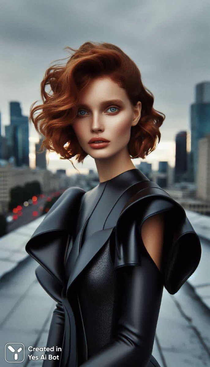 Завораживающий портрет модели в авангардном образе, воплощающем смелое сочетание моды и уверенности. Изящный скульптурный наряд из неопрена подчеркивает ее безупречную фарфоровую кожу и динамичные огненно-рыжие локоны, создавая эффектную контрастность с пронзительными глазами цвета морской волны. Взгляд, брошенный через плечо, излучает непринужденную элегантность и легкую дерзость. Модель стоит на крыше здания, откуда открывается панорамный вид на бурлящую жизнь города – яркий фон, дополняющий атмосферу современности и энергии. Эта работа представляет собой уникальный сплав изысканности и остроты, вдохновленный творчеством Рене Магритта и Грега Рутковски. Исключительная детализация в 32K позволяет рассмотреть каждую мелочь – от текстуры ткани до бликов света в глазах модели, создавая ощущение полного погружения в мир высокой моды и визуального совершенства. Картина поражает своей выразительностью и мастерством исполнения, демонстрируя гармоничное сочетание классической красоты и современных тенденций. Это не просто изображение, а настоящая ода стилю и уверенности в себе, воплощенная в цифровом искусстве