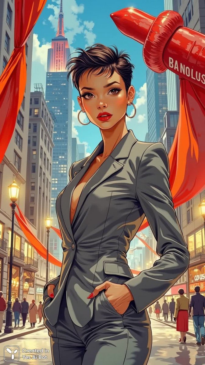 Взгляд уверенной и стильной женщины в элегантном сером брючном костюме приковывает внимание. Её дерзкий пикси-стриж подчеркивает решительный характер, а длинные острые ногти ярко-алого цвета гармонично сочетаются с игриво подведенными красными губами. За ней простирается футуристический городской пейзаж, где небоскребы окутаны струящимися складками бархата, создавая ощущение роскоши и театральности. Уличные фонари мерцают подобно драгоценным камням, добавляя сцене неповторимый шарм. Вдали парит гигантский надувной тюбик помады – неожиданный и забавный элемент, который вносит нотку игривости и фантазии в эту визуальную историю. Изображение воплощает собой смелый стиль, современную эстетику и дерзкое сочетание элегантности и юмора. Это ода уверенности в себе и любви к моде, представленная в виде яркой и запоминающейся картины современного искусства, где реальность переплетается с мечтами о гламуре и безграничном творчестве. Вся сцена дышит чувственностью и индивидуальностью, отражая дух модной эпохи, где границы между искусством и повседневной жизнью стираются