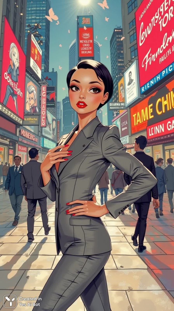 #3 envision a striking bimbo with a sleek pixie hairstyle, wearing a luxurious gray suit that hugs her hourglass figure perfectly. her long, immaculate nails boast a luscious crimson hue, and her lips are painted in fiery red. she stands in a lively city setting, where the pavement sparkles like diamonds and massive neon signs dance in the background, with cheeky quotes from iconic fashion figures floating around like butterflies.