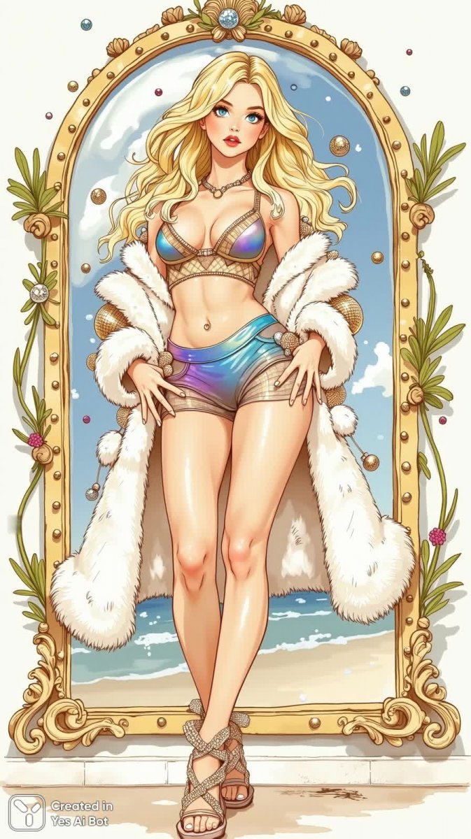 #5 a chic blonde beauty showcases her long legs in a daring outfit combining high-waisted holographic shorts with a sheer organza crop top, layered with an extravagant fur coat that contrasts against her snow-white skin. her hair elegantly cascades in beachy waves adorned with miniature disco balls, and the backdrop features a giant, cheeky cartoonish mirror giving exaggerated reflections of her pose, contributing a touch of surrealism and lighthearted humor to the high-fashion tableau.