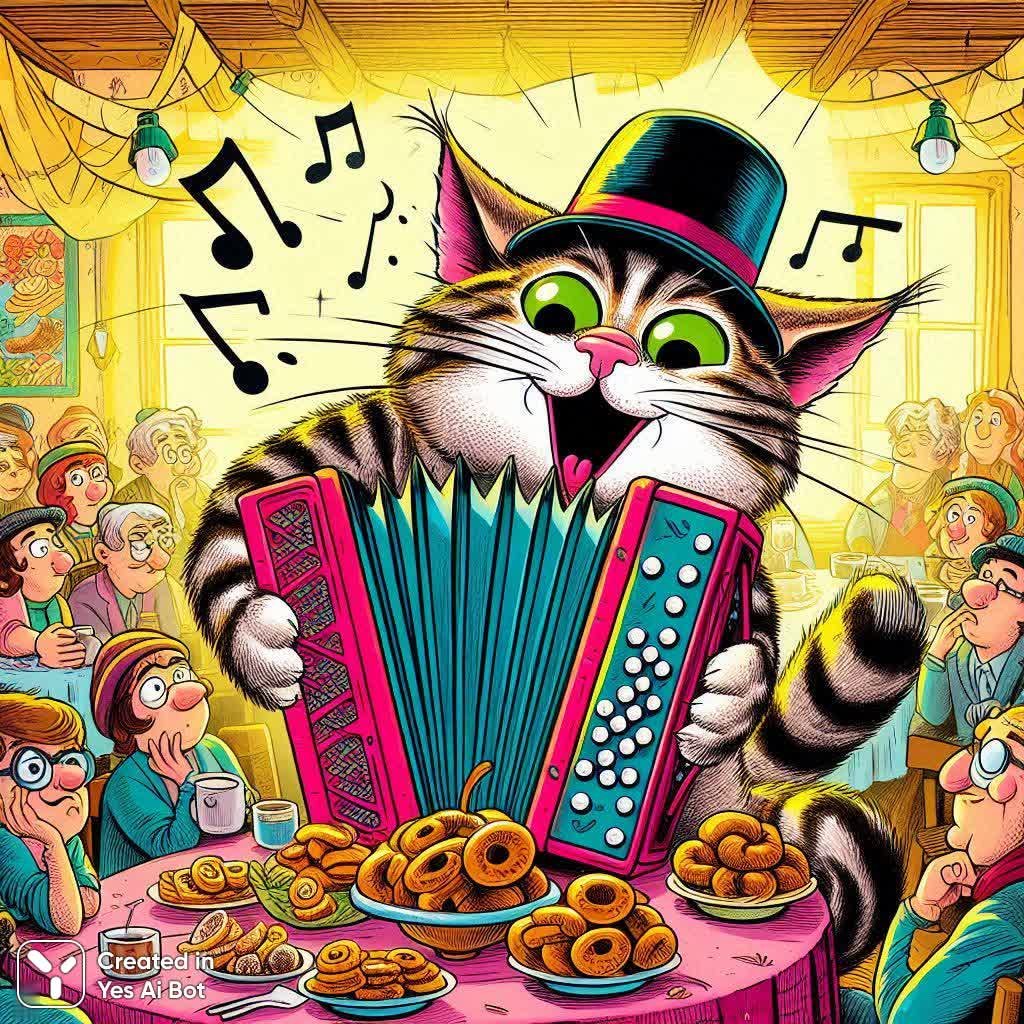 Завораживающее зрелище, где абсурд встречается с кулинарным искусством! На сцене разворачивается сюрреалистическая картина: эксцентричный кот, мастерски владеющий баяном, исполняет свои произведения для равнодушной публики. Его взгляд полон загадочности и скрытой угрозы, ведь под лапой у него покоится опасная связка динамита, добавляющая щепотку адреналина в атмосферу происходящего. Вокруг музыканта раскинулись накрытые столы, ломящиеся от обилия домашних вкусностей: ароматные пироги, аппетитные салаты и сладкие рогалики, способные пробудить даже самый притупленный аппетит. Однако зрители остаются невозмутимыми, их лица выражают лишь скуку и пресыщенность, словно они видели подобное множество раз. Вся эта фантасмагорическая сцена создает ощущение гротескной реальности, где музыка, еда и опасность переплетаются в причудливом танце. Это не просто концерт, это перформанс, который заставляет задуматься о хрупкости равновесия между искусством и хаосом, вкусом и безразличием, жизнью и смертью. Наблюдение за этим необычным действом вызывает одновременно восхищение и тревогу, смех и задумчивость. Это история о том, как талант может столкнуться с равнодушием, а гениальность – с абсурдом. Концерт кота-баяниста с динамитом под лапой – это метафора нашей жизни, в которой каждый из нас играет свою роль на сцене мироздания, надеясь быть услышанным и понятым. И кто знает, какие сюрпризы приготовила нам судьба?