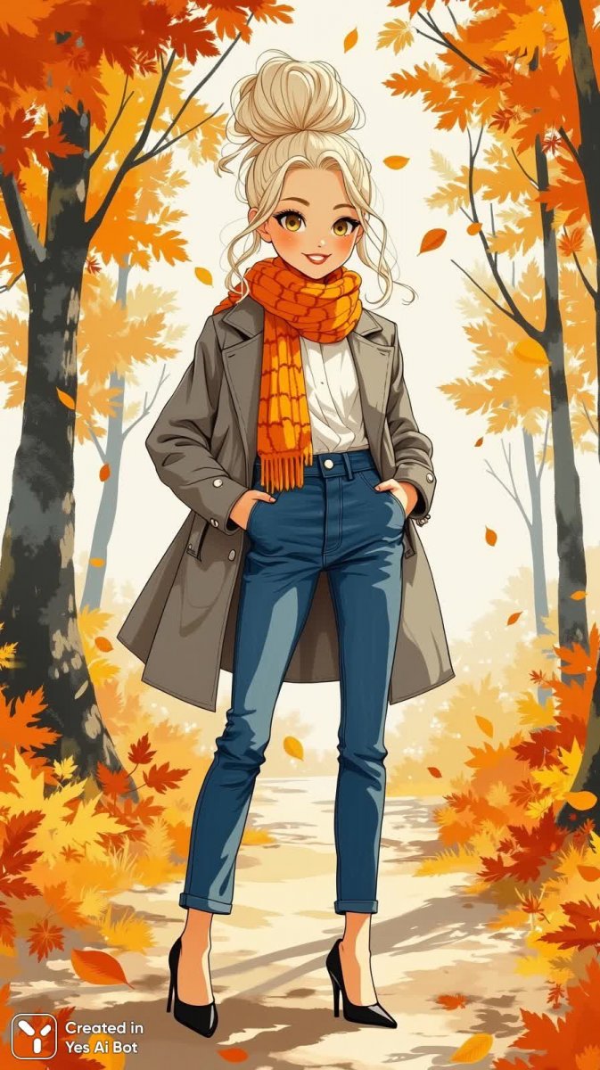 #1 beautiful bimbo girl with playful platinum blonde hair styled in an extravagant updo, wearing a chic short gray coat, a vibrant orange knitted scarf casually draped around her neck, high-waisted blue denim jeans, and edgy black stilettos; striking a confident pose while smiling warmly amidst an enchanting autumn landscape full of swirling leaves in shades of gold and amber—illustration style with lively ink drawing details.