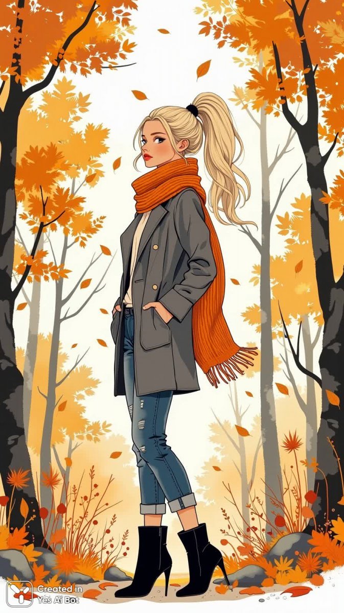 #5 a gorgeous bimbo girl with luminous blonde hair styled in a fabulous high ponytail, layered in a chic short gray coat, wrapped in a cozy orange knitted scarf; effortlessly matching with contemporary blue jeans and edgy black stiletto boots; standing amidst a wondrous autumn landscape, where the trees seem to sing with joy—illustration paired with delicate ink drawing for an expressive, lively scene.