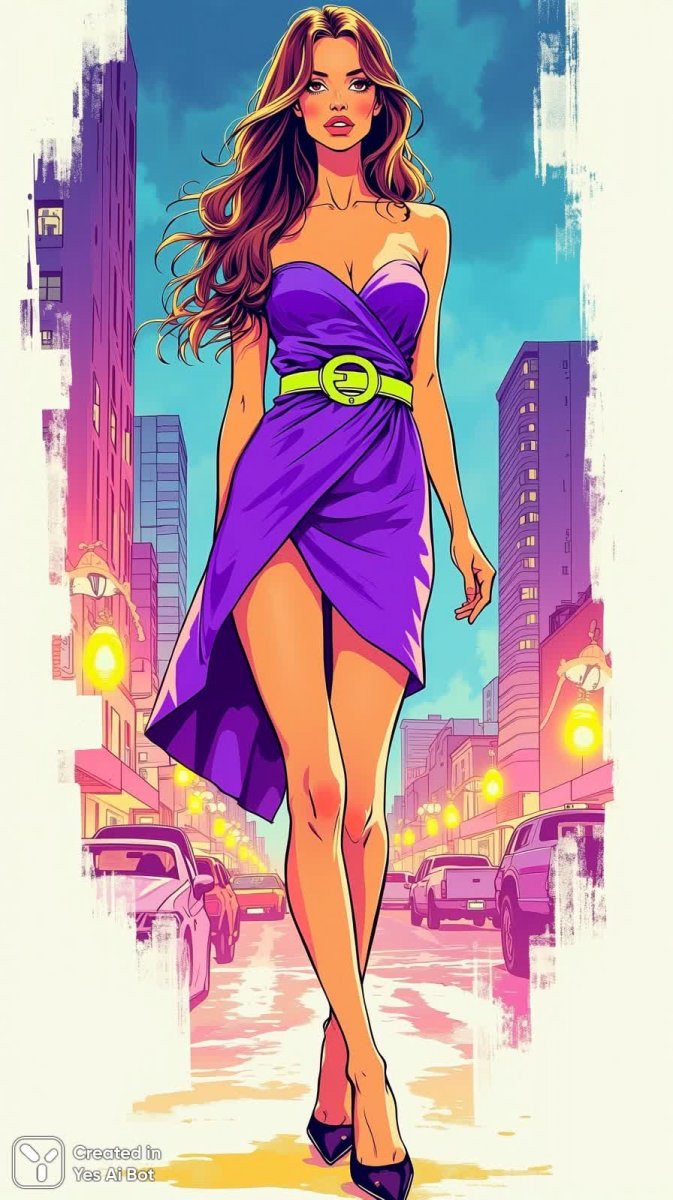 illustration, ink drawing, fashion model, neon colors standing in vivid purple mini dress with asymmetric hemline, cinched waist with neon green belt, long wavy hair cascading down, wearing black stiletto heels, bright city lights in the background.