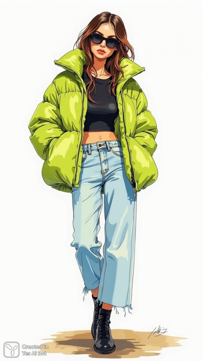 illustration, ink drawing, fashion model, posing in lime green puffer jacket with oversized collar and black cropped top underneath, paired with light blue mom jeans, knee-high black boots, styled with long wavy hair and sunglasses, street style aesthetic, energetic vibe.