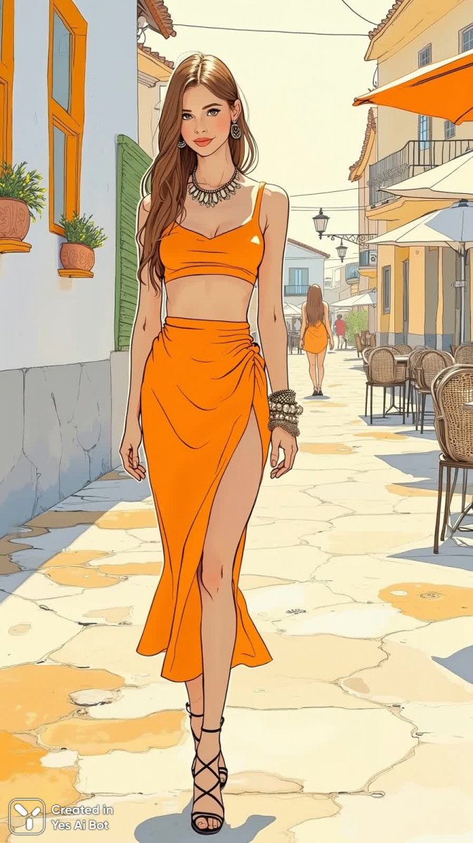 illustration, ink drawing, fashion model, in vibrant orange two-piece crop top and skirt set, high-waisted fit with side slit, completed with strappy black heels and a statement necklace, long straight hair cascading down shoulders, sunny outdoor setting, trendy atmosphere.
