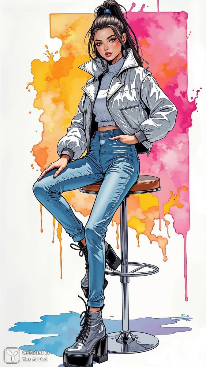 illustration, ink drawing, fashion model, neon colors posing in a futuristic silver metallic jacket, paired with high-waisted skinny jeans and platform boots, hair pulled back into a high ponytail, seated on a bar stool in a minimalist studio, embodying an edgy look.