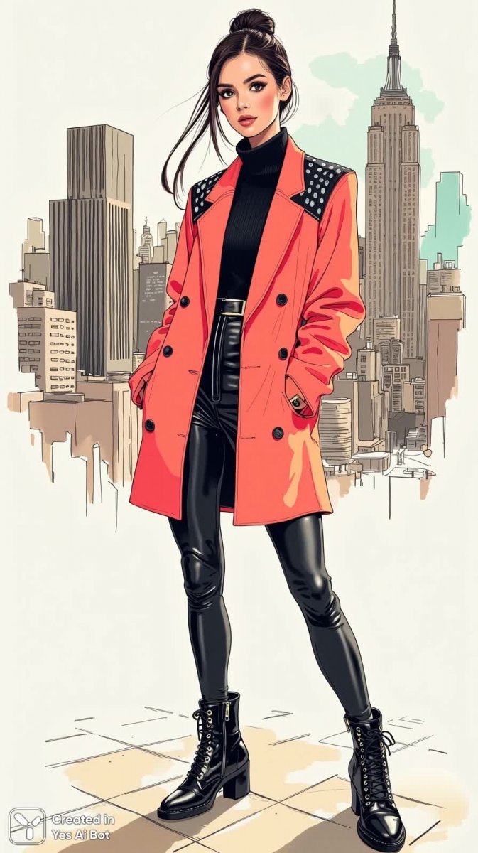illustration, ink drawing, fashion model, neon colors posing in neon coral oversized blazer with shoulder pads, wearing fitted black leather leggings with zippers, chunky black ankle boots, long dark hair styled in a sleek bun, standing confidently against a cityscape backdrop.