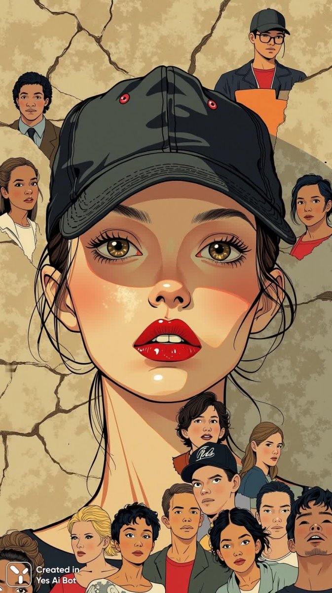 the image is an artistic rendering featuring a person's face with intense red lipstick, wearing a baseball cap against a cracked concrete surface creating contrast, surrounded by smaller images of people with various expressions forming a visual effect resembling shattered photographs and a textured background. #role_red_lips