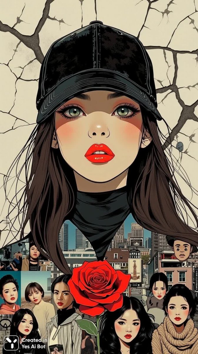 the image is a striking composition featuring a woman's face in the center, surrounded by fragmented photographs and a textured cracked concrete surface adding an urban feel, she wears a black baseball cap with long dark hair, lips painted neon red against a collage of faces and scenes, creating dramatic contrast, black outfit and high collar against a cracked white background. #role_red_lips