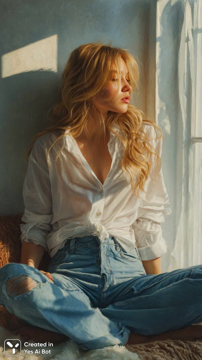 Нежная утренность в солнечных лучах. Эта реалистичная картина, вдохновленная творчеством Росса Тран, запечатлела момент покоя и умиротворения. На кровати, рядом с окном, сидит привлекательная девушка с длинными светлыми волосами, облаченная в простую белую рубашку и рваные джинсы. Она погружена в чтение книги, а мягкий солнечный свет ласкает ее лицо и комнату, создавая теплую атмосферу. Изображение идеально подходит для фона телефона или iPhone, предлагая расслабляющий визуальный опыт. Девушка с белоснежными волосами напоминает образ Бетти Купер, добавляя картине нотку знакомой красоты. Высокое разрешение и художественная детализация делают эту работу потрясающим обоем, наполненным светом и легкостью. Картина передаёт ощущение домашнего уюта и спокойствия, словно запечатлев мгновение тихой радости в повседневной жизни. Это идеальный фон для тех, кто ценит красоту простых вещей и предпочитает эстетику мягких тонов и реалистичных деталей. Насладитесь этой прекрасной сценой, которая станет источником вдохновения и позитива каждый день