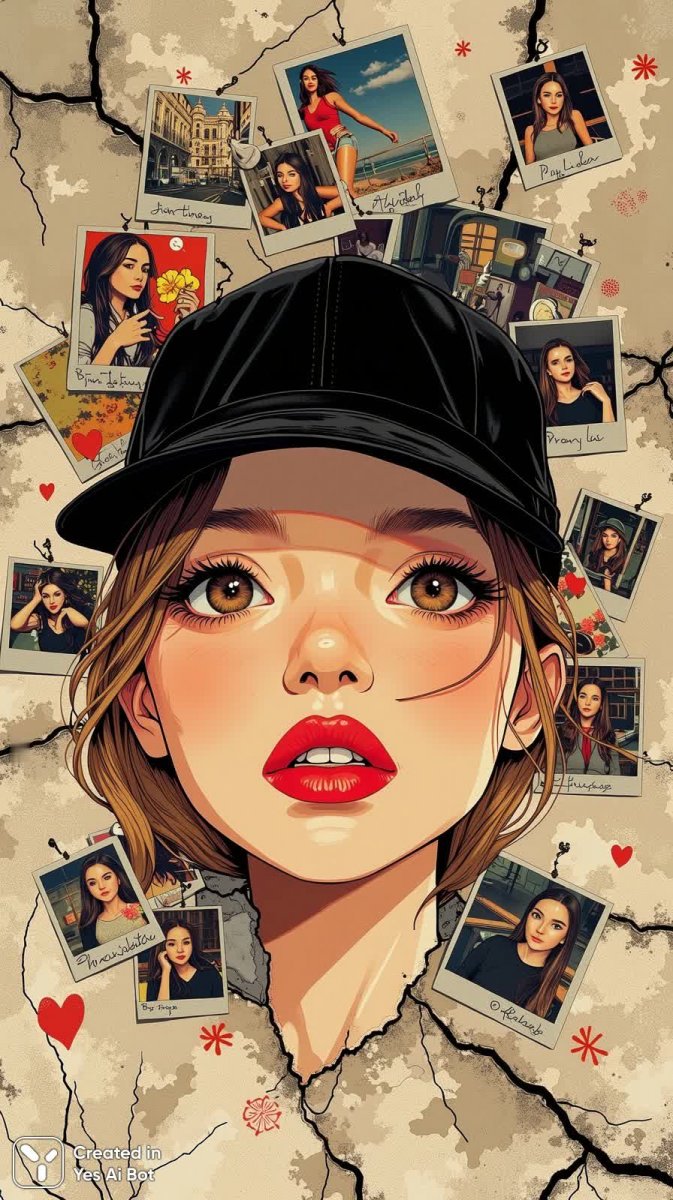 5. the image features a woman's face clad in a black cap, lips vividly red, emerging from a disarray of photos against a cracked concrete background for an urban feel.