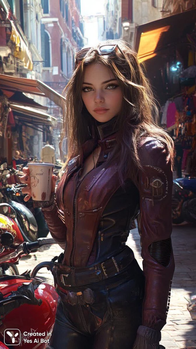 A digital render of an ultra-realistic portrait integrating the rococopunk aesthetic, featuring a vibrant young lass garbed in finely-creased, wind-ruffled leather biker attire, her skintight gloves clinging tightly, seated in the whirling chaos of Venice's bustling open market, her free hand humbly clenching a latte cup, Rococopunk, biker girl, latte, Venice --ar 9:16 --v 6.1