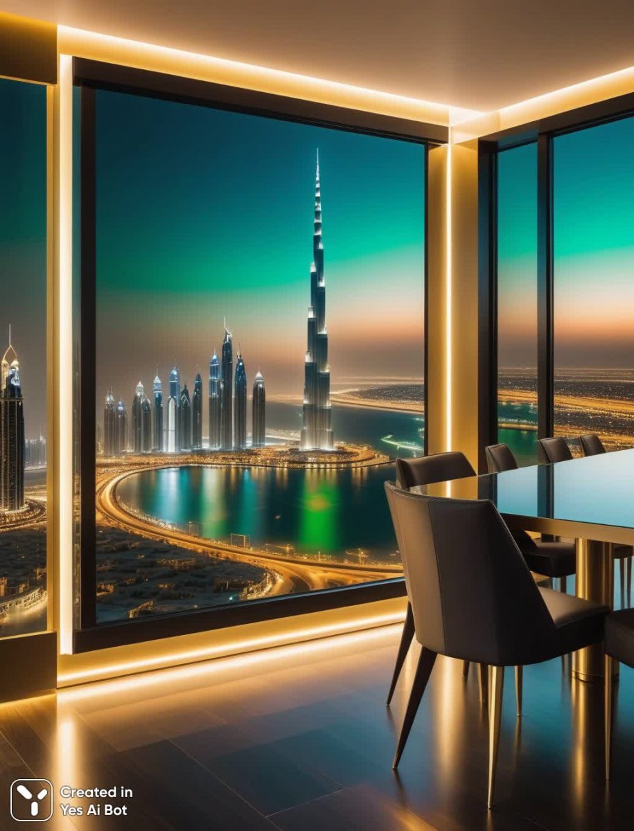 RIGHT SIDE (Cinematic Trailer): Show a stunning cinematic frame—golden hour sunset streaming through floor-to-ceiling windows of a Palm Jumeirah penthouse, atmospheric lighting, a champagne glass in foreground (lif...