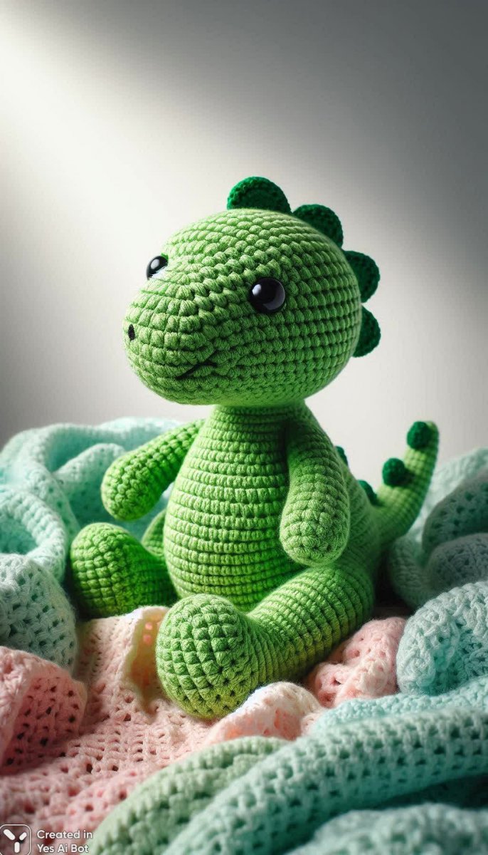 crocheted dinosaur toy made of green yarn, features small arms and legs, round body, and friendly face with big eyes, sitting on soft pastel-colored blanket, background is plain white.
