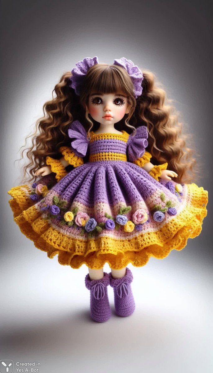 crocheted doll with long brown hair styled in pigtails, wearing a purple and yellow dress with ruffled sleeves, round neckline, skirt made of yellow yarn with purple flowers, legs made of pink yarn wearing purple socks, BG is plain white.