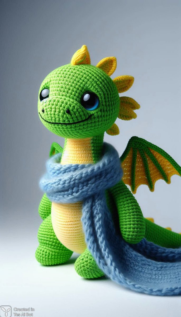 crocheted dragon toy with bright green body, small wings made of yellow yarn, round face with big black eyes and a tiny smile, wearing a blue scarf, standing upright on a white background, overall appearance whimsical and friendly, BG is plain white.