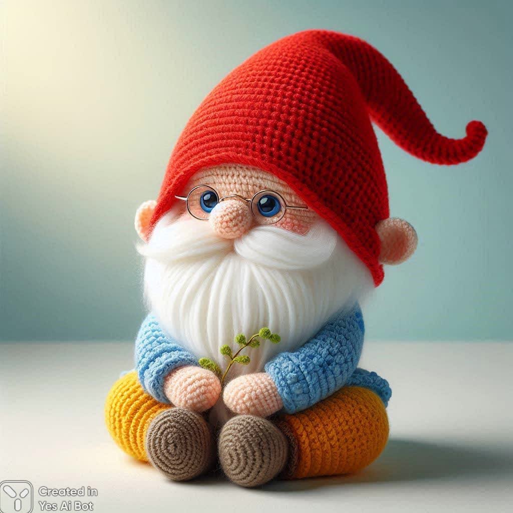 crocheted gnome with red hat and white beard, sitting cross-legged on a white surface, wearing a blue and yellow striped shirt, small glasses perched on nose, looking whimsical and cozy, BG is plain pastel color.